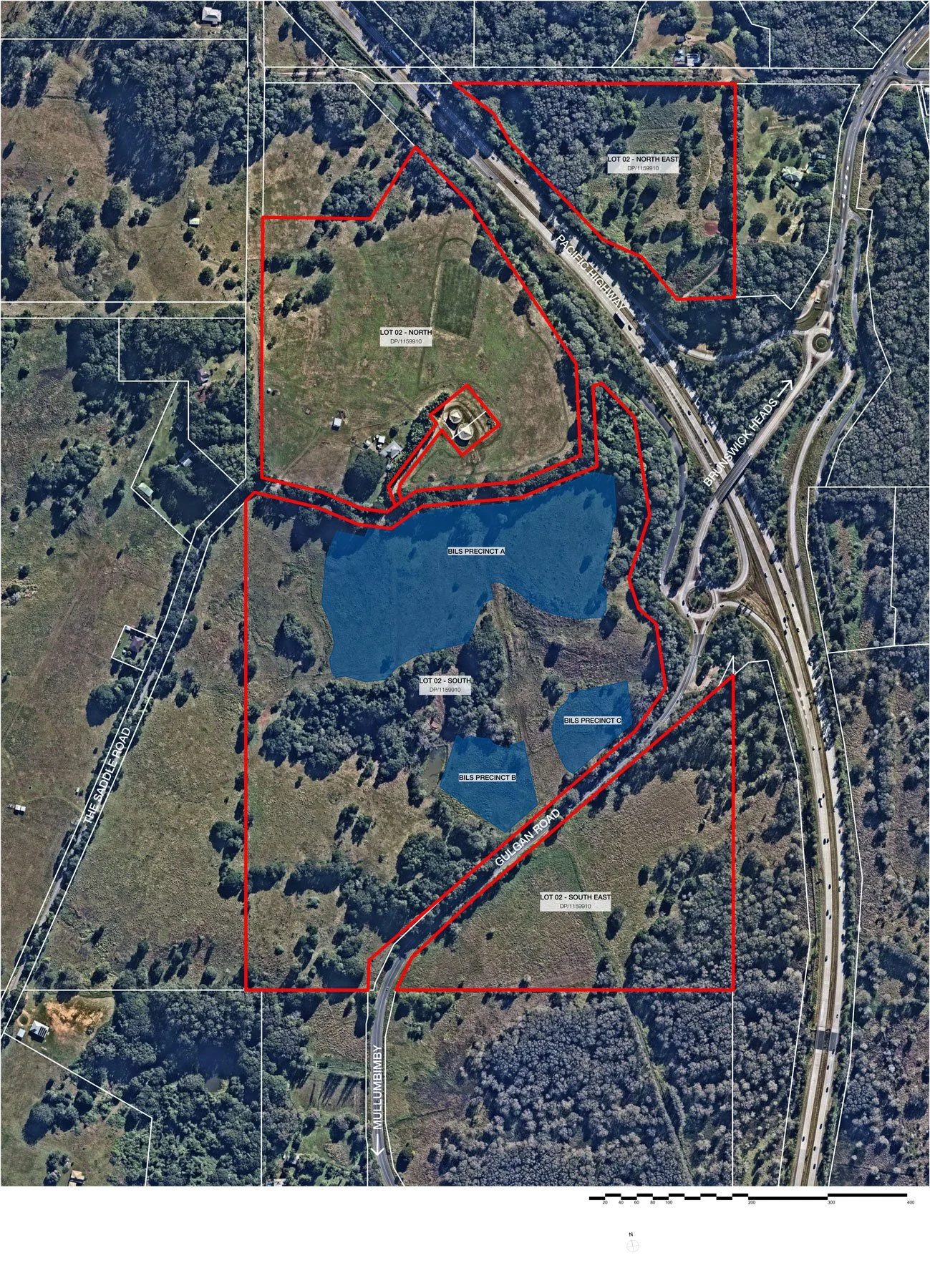 The subject site, Lot 2 DP 1159910, covers 52.13 hectares of hilly, degraded farmland and has an irregular shape. It is divided into four parts with frontages to The Saddle Road, Gulgan Road, Bashforths Lane, the Pacific Motorway, and an unnamed road that links to Tweed Street on the east. The actual BILS development area is just 6.5 hectares.